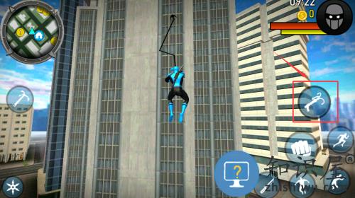 3、点击钩锁按钮,发射蛛丝攀爬高楼建筑。