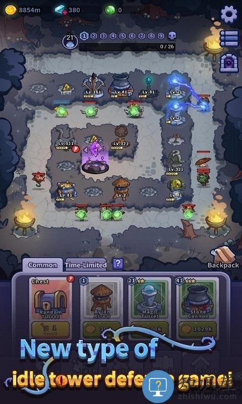 1、通过放置各类防御塔组成防线抵御魔物进攻。