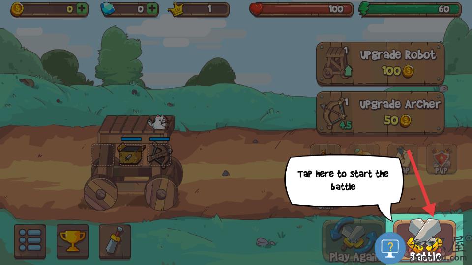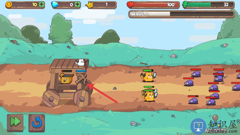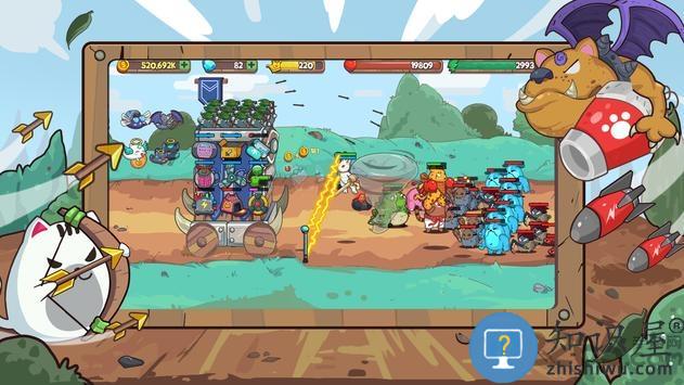 1、通过升级炮车来部署更多猫战士对抗敌人。
