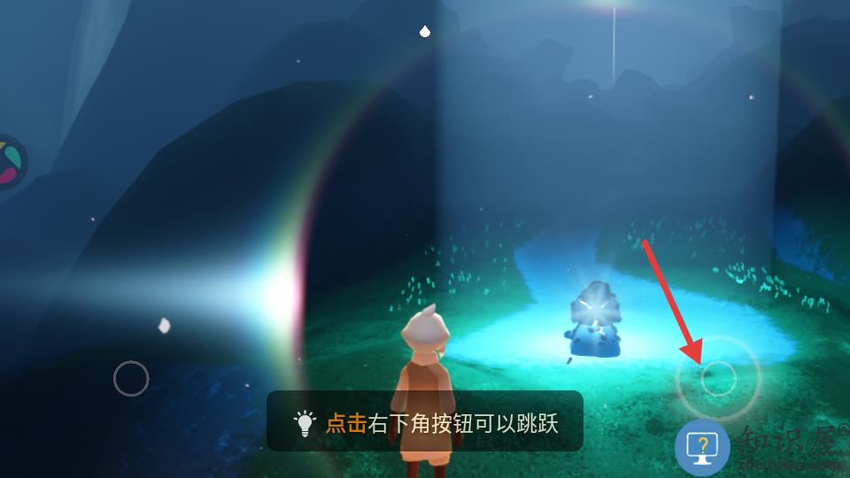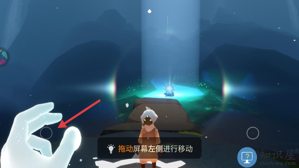 2、找到蓝色人影并触碰它,跟随光点,我们可以看到一个深灰色的石像,点燃石像上的火苗,它就会教我们一个新的互动姿势。