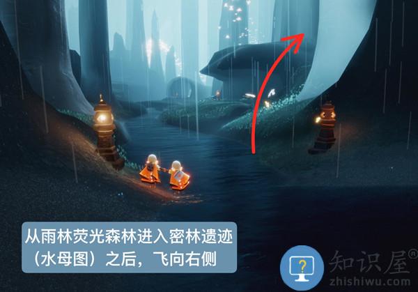 1、首先到雨林密林遗迹,在水母图往右侧飞。