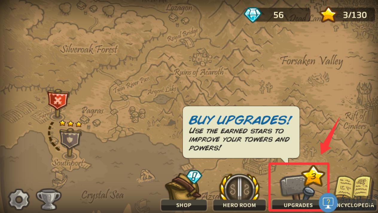 3、进入游戏界面点击升级来提升炮塔箭塔的战斗力。