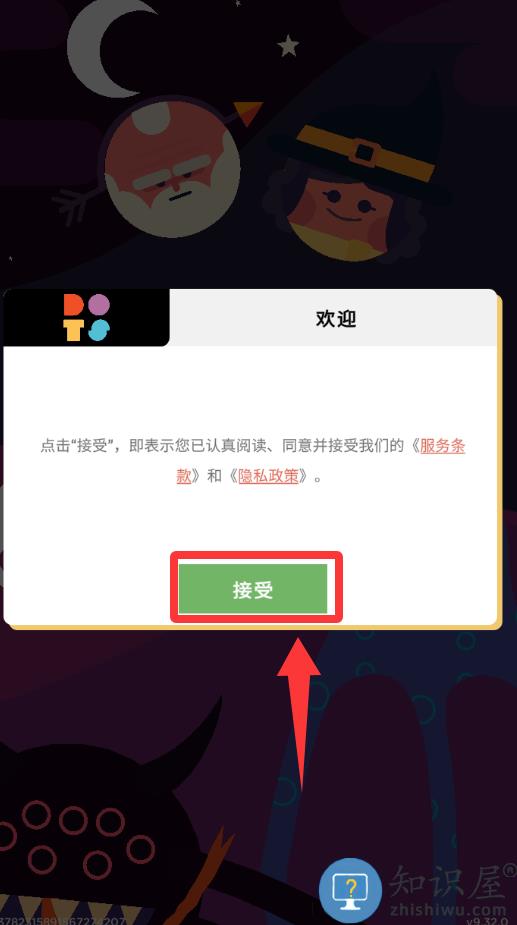 1、点击红色框框里的接受并进入游戏。
