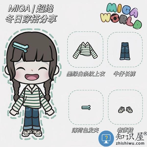 1、墨绿白条纹上衣+牛仔长裤+薄荷色发夹+老爹鞋。
