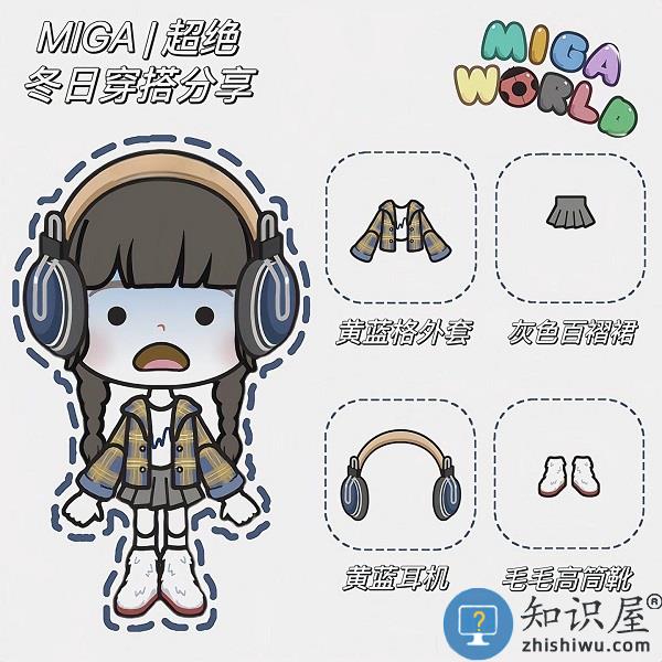 3、黄蓝格外套+灰色百褶裙+黄蓝耳机+毛毛高筒靴。