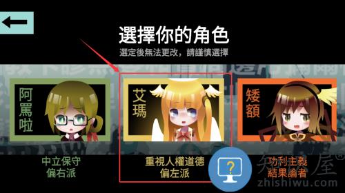 游戏开局玩家可从中立保守的阿玛拉,重视人权道德的艾玛,功利主义的矮额中挑选一名参与选举,不同的城市所侧重的元素也略有差异,而这些角色之间的唯一差异就是初始的道德、秩序和民意值不同,通过参与处理法律、认知、事件和经济可以让这些数值发生改变,而怎么改变,力度如何则就完全取决于玩家的决策了.
