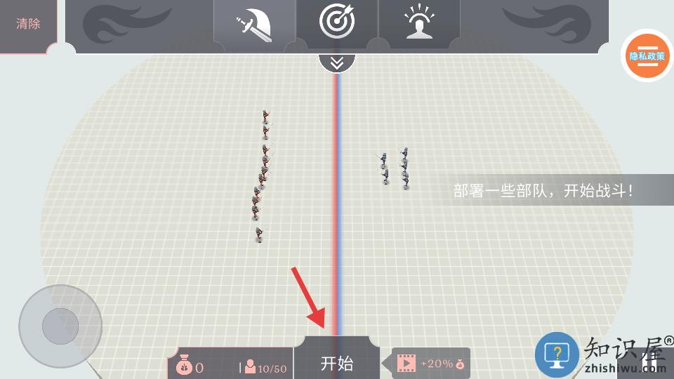 1、通过关卡解锁各类士兵并合理布置阵容。