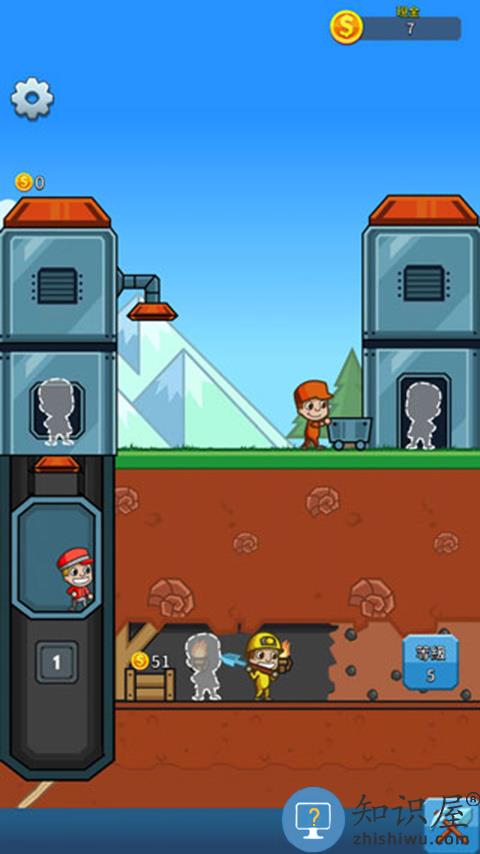 1、在游戏中首先根据新手指引点击地下矿中的穿黄色衣服的矿工,然后他会进行挖矿,挖好矿后会背到左边靠近电梯的小箱子里面,这时点击在电梯中的红色衣服矿工,他会把箱子里面的东西传送到上方机器里面,然后点击在地面推小车的红衣服矿工,他会推着小车到机器下面接金币,送到原地。这三个矿工的规律性比较强,下面黄色的矿工可以一直进行挖矿,然后电梯里的矿工只需要吧挖好的矿石进行往上运送即可,地面上的工人,在机器下接住矿石推回原地就可以获取金币。