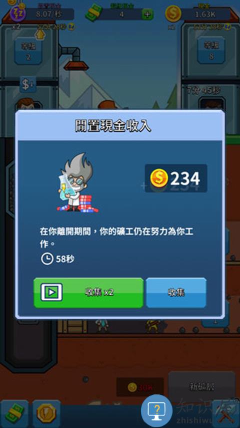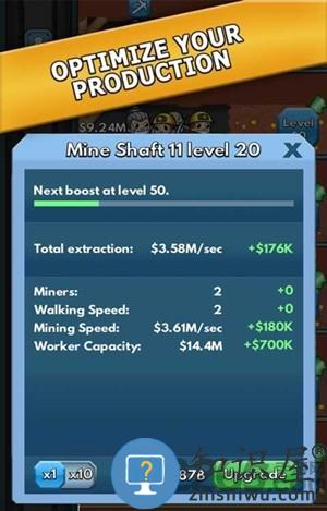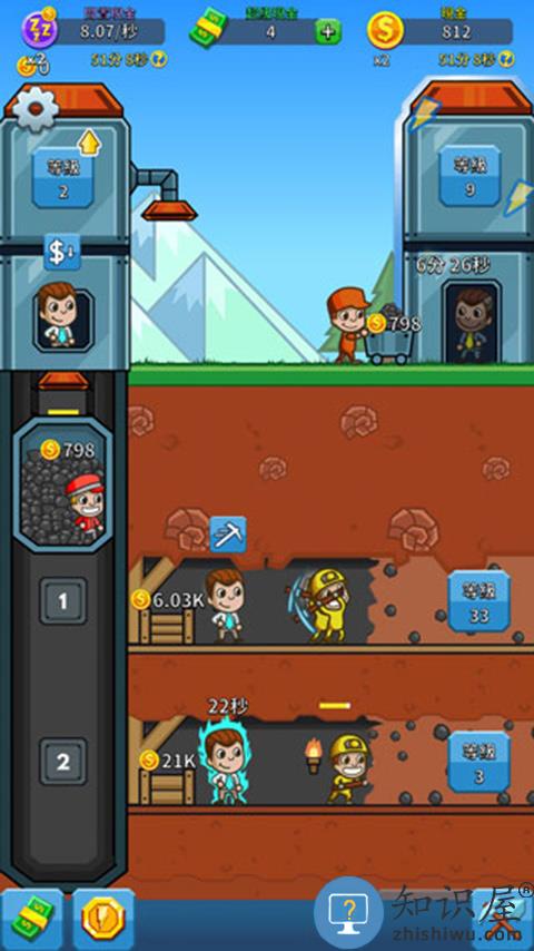 4、电梯运输和地上的运输工需要480个金币才能进行升级,可升级运输速度,运输量,运输工人数等等。在玩家们攒够金币后即可开始升级。当经理头上出现小锤子的图案时,点击小锤子可以对开采的矿工进行加速,不过只有60秒的加速时间。黄色的矿工的箱子里最多可以装1k的金币,电梯的也是,地上推小车的矿工也同样。