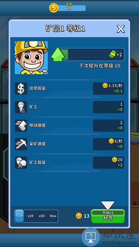 2、升级是大家比较关心的一个问题,升级在右下方黄色找人挖金矿那里,只要金币足够,上面就会有向上的箭头提示,然后就可以进行升级。随着级别的升高,所挖出来矿石的金币也会随着升高,最初1级的时候一次挖11个金币,到5级的时候一趟就可以挖取29个金币。升级的越快,所获得的金币就越多!