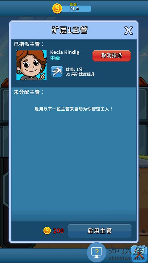 3、升级到5级的时候,大家就可以雇佣经理了,矿区经理,电梯经理和地面经理,都是一百金币,经理的作用就是一直监督工人干活,可以使玩家们不用一直点击工人干活,这个时候挂机他们也会自动干活。随着矿区2的开采,经理的雇佣价格也会相应的变高。矿屋1等级为10的时候,地下的矿中就会出现两个黄色衣服的矿工,一次可挖94个金币的矿石。