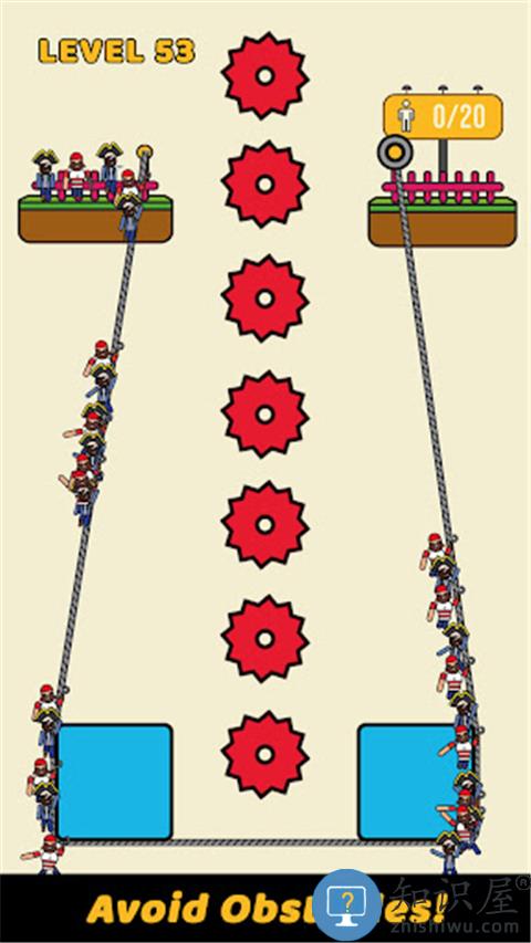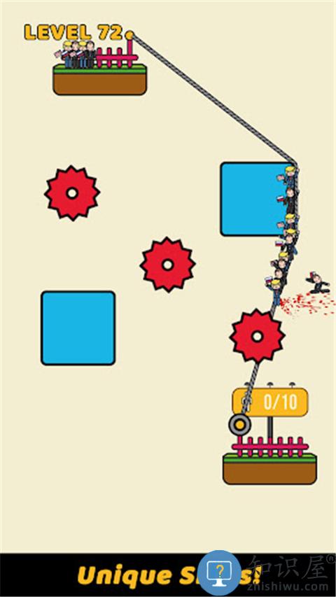 绳索救援考验你的策略与反应能力,玩家需要画出一条绳索,引导空中的人物避开移动的障碍,安全降落到地面,点击屏幕可让更多同伴依次滑下,但必须谨慎安排时机与路线,简洁的玩法中蕴含着对规划能力的挑战,每关都需要巧妙思考才能成功脱困。
