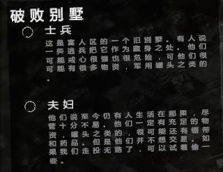 剧情一:商人,显示可能的交易,从地图左侧进入,搜刮左边房子的物资就好,带上撬棍跟一个锯子,不建议放养。
