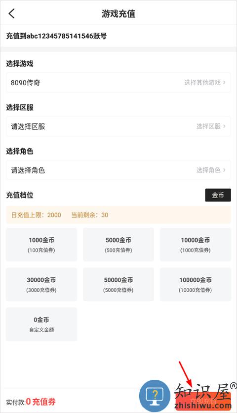 3、然后选择游戏区服等,充值额度,点击充值即可。