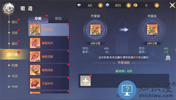 4、然后是装备升星需要达到橙色以上品质才能升星,升星之后有一定几率额外获得属性词条,消耗同名同品质装备可以有几率提高一颗星。这是只有在高阶装备时才会用到的方式初期不建议选择。