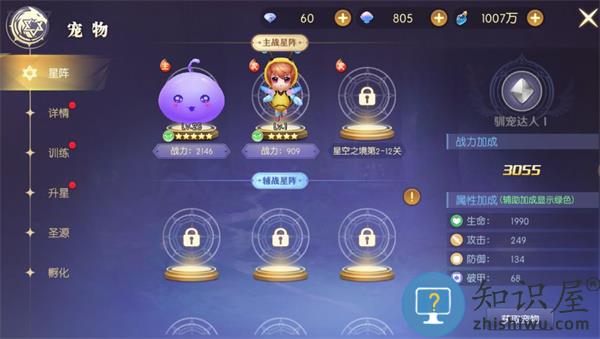 5、宠物也是不可忽视的一方面,通关星空之镜对应关卡后,最多能够选择3名宠物进入主战行列,还能选择6名宠物进入辅助行列。最重要的就是三名主战宠物,一定要选择SSR品级的橙色宠物,不仅技能效果好属性也很强力。在选择好宠物后还能进行等级提升,以及资质训练和升星强化。训练时只要当一条资质达到满级就能进行突破,只有不断的突破和升星,才能最终形成强悍的战斗帮手。