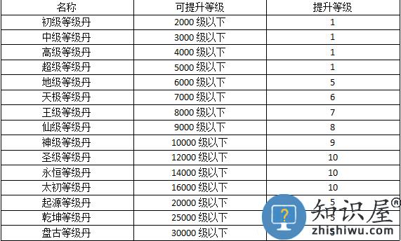 本服等级通过使用对应等阶的等级丹提升,等级丹分为15个等级,不同等级丹对应提升如下。