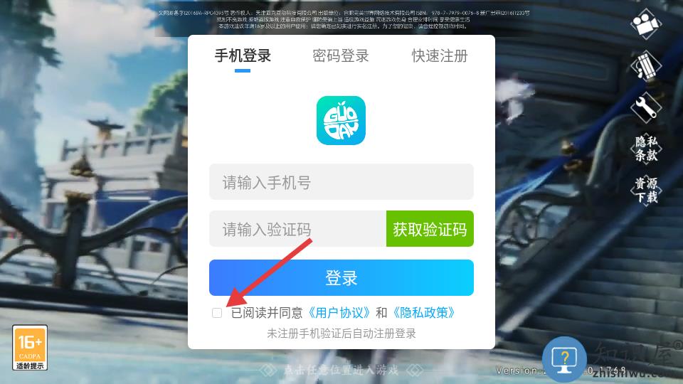 3、勾选用户协议输入手机号验证码登录。
