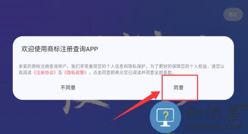 1、在商标注册查询APP中点击"同意"欢迎弹窗,进入应用首页。