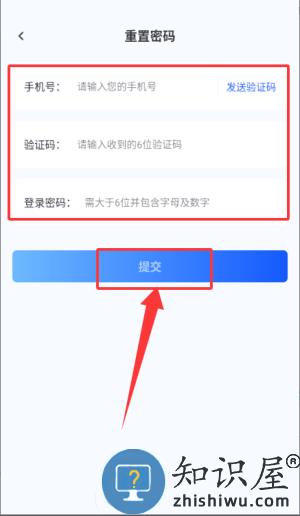2、在该页面填写手机号验证码及新密码,点击提交完成重置。
