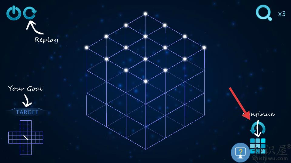 滑动你的手指在绘制线条的多维数据集,直到模式匹配与目标。箭头:旋转立方体。放大镜:得到一个提示。