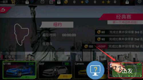 1、在经典赛界面,点击手指处的绿色出发按钮,开始比赛。