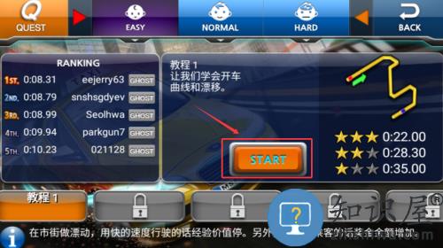 1、点击红框箭头指向的橙色START按钮,开始漂移练习。