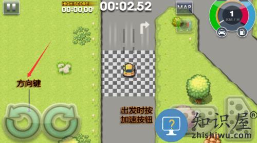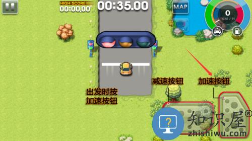 2、按下红框箭头指向的红色加速按钮,启动赛车。