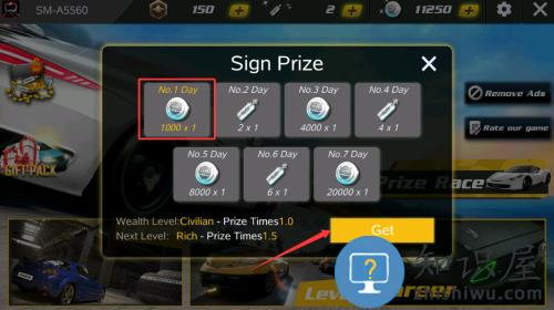 1、第一天签到奖励界面,点击红框Get按钮领取。