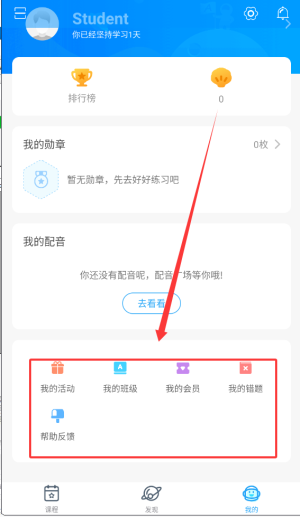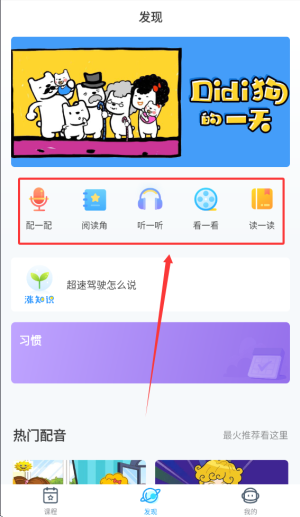 3、发现板块提供了多样化的学习互动模块,包括图文匹配练习阅读专区听力训练视频观看及跟读练习。