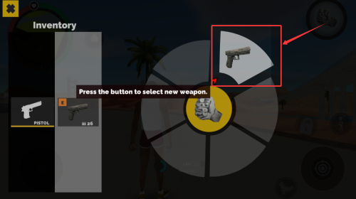 1、在装备轮盘中,选择新手枪进行装备。