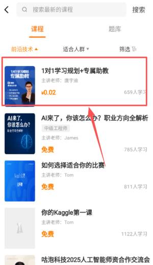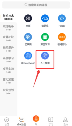 2、登录后进入成长路径页面,在前沿技术分类选择人工智能。