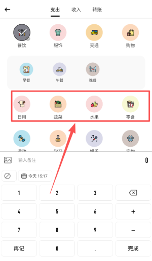 2、选择消费分类如餐饮或购物,输入金额并添加备注,支持自定义分类标签满足个性化需求。