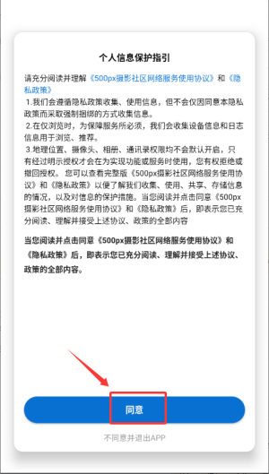 1、首次启动应用,请在个人信息保护指引页面点击同意。