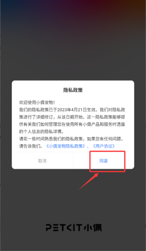 1、启动小佩宠物应用,先在隐私政策页面点击同意按钮继续操作。