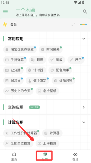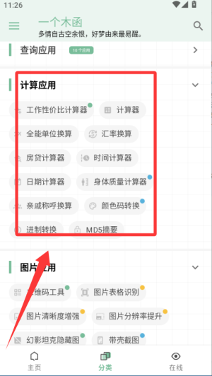 1、打开应用后,首页会按分类展示工具,比如计算类或图片处理,直接点击需要的功能即可开始使用。