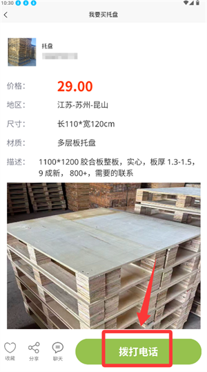 3、选定托盘后查看详情,拨打电话联系卖方。