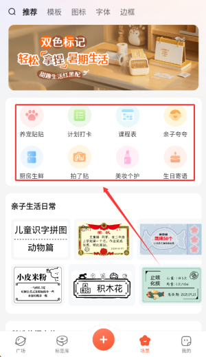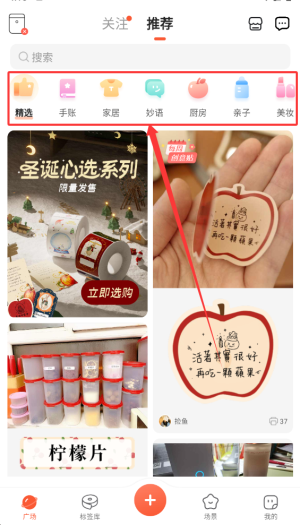 3、广场板块展示精选内容、手账模板、家居布置、妙语摘录、厨房技巧及亲子互动等分类。