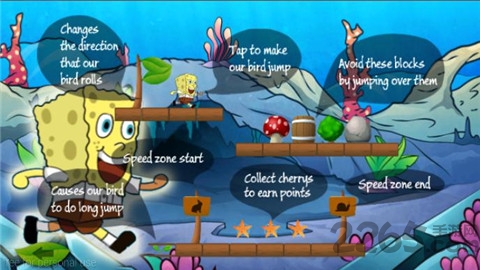 游戏中玩家将扮演海绵宝宝为寻找丢失的汉堡展开全新的跑酷旅程。玩家可以控制海绵宝宝施展跑、跳、踩上泡泡滑翔等一系列动作,避开障碍收集金币。
