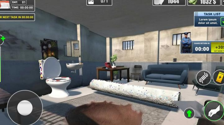 1、牢房内配备完整的生活设施与家具,包括马桶、沙发、床铺等,需观察其布局以寻找可利用的挖掘点。