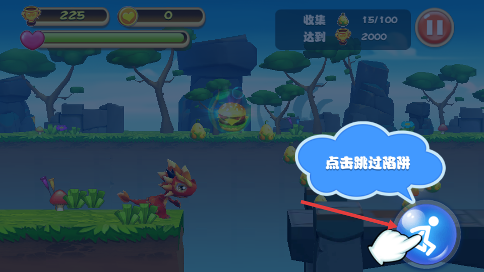 1、游戏采用自动奔跑模式玩家操控跳跃与攻击进行闯关。