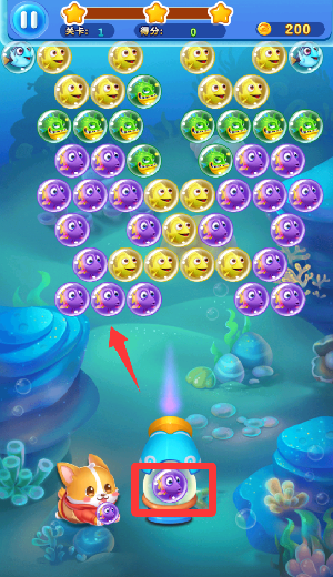 4、炮弹是紫色的,把它射向相同颜色就可以消除。