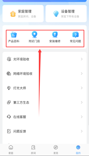 个人中心增加安装维修、 附近门店、灯光大师和产品库入口。