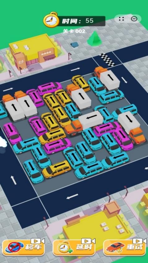 4、游戏难度循序渐进,前期帮助玩家掌握基础技巧,后期则会出现结构复杂、车辆密布的庞大停车场,充分满足解谜爱好者的挑战欲。