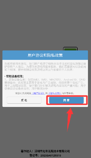 1、点击用户协议和隐私政策里的同意并继续。