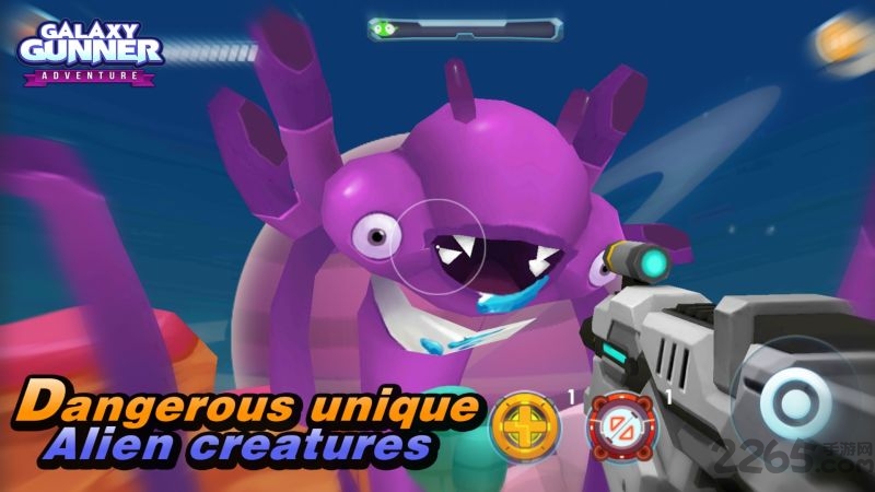 1、以第一人称视角操作,使用虚拟摇杆移动并瞄准,点击射击按钮攻击来袭的外星生物。
