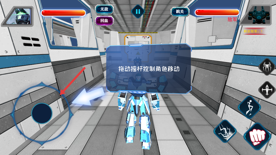 1、通过拖动摇杆控制角色移动点击跳跃按钮进行跳跃。