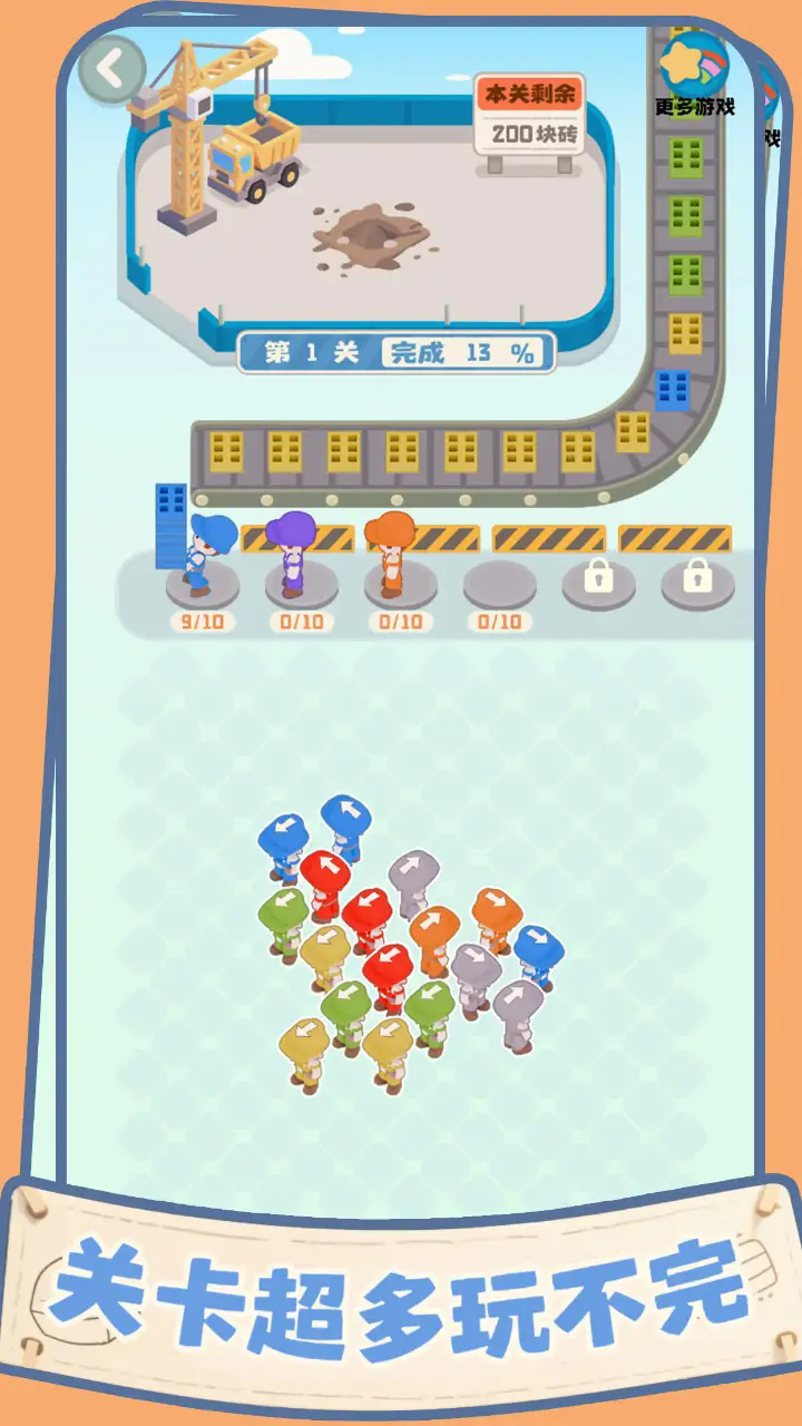 盖个大别墅的建造乐园里,您需安排工人搬运对应颜色的砖块,通过匹配工人衣帽与砖块色彩完成消除任务,引导他们沿固定路线将材料送至指定区域,每成功通关即可建成一栋崭新别墅。