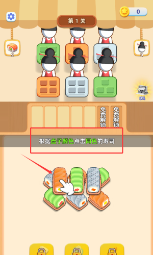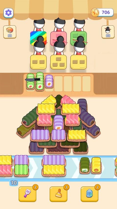 1、游戏在传统消除玩法上进行了创新,玩家需将寿司分给颜色匹配的顾客来完成消除,简单的规则背后考验着顺序规划与策略选择。