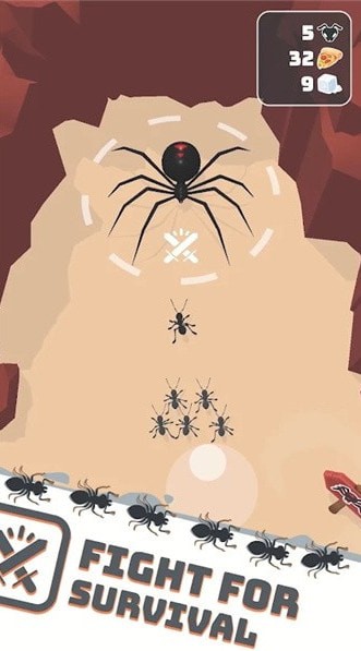 2、蚂蚁之间也会产生各种战争,在不同的蚂蚁地盘争夺领土和食物,合理的布置阵容赢得胜利。